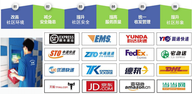 投放快遞柜(1000個以上快遞格口投放,7*24小時服務);快遞服務中心(專業人員+標準運營流程)、全方位貼心服務。